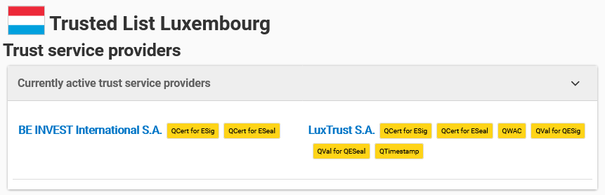 Au Grand-Duché de Luxembourg, l'ILNAS (Département de la confiance numérique) est en charge de la gestion de cette "Trusted List". Cette dernière est mise à jour au moins tous les six mois.