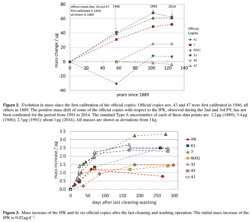 Contrairement aux autres unités fondamentales du Système International, définies via les constantes fondamentales de la physique (constante de Planck, vitesse de la lumière, fréquence de transition hyperfine du césium 133 …), le Kilogramme reste la seule unité définie par un artéfact, l’International Prototype of the Kilogram (IPK). S’il était adéquat et scientifiquement cohérent en 1889 de définir le kilogramme au moyen d’un cylindre de platine iridié, la Figure suivante montre que même au prix de conditions de conservation extrêmes et rigoureuses, des dérives temporelles des masses de l’IPK et de ses copies sont inévitables et imprévisibles (Metrologia 52 310-316(2015)) :