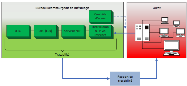 Le Temps Universel Coordonné (UTC), temps de référence mondial, est généré par le Bureau international des poids et mesures (BIPM) en tant que moyenne des valeurs fournies par les instituts nationaux de métrologie des pays participants. Le Luxembourg avec le BLM est l’un d’entre eux. Le BLM génère l’échelle de temps de référence local UTC(LUX), représentation luxembourgeoise du Temps Universel Coordonné (UTC), qui est la base du temps mondial. La participation d’UTC(LUX) au temps UTC est officielle depuis novembre 2018. Elle est réalisée par le biais d’un système appelé Circulaire T, mis en place par le BIPM. Depuis lors, le BLM doit garantir la stabilité et le fonctionnement sans interruption de ce service.
