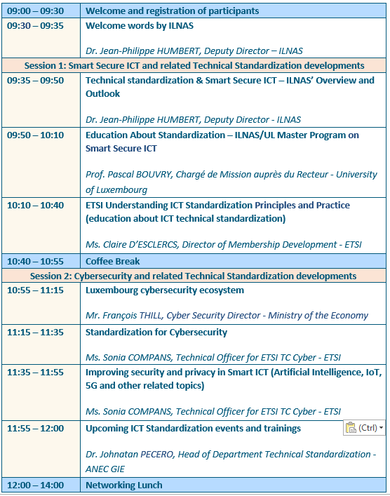 La première session débutera avec une vue d’ensemble de la normalisation technique et des Smart Secure ICTs au Luxembourg. L'accent sera ensuite mis sur l’éducation à la normalisation, avec la présentation des projets communs entre l'ILNAS et l’Université du Luxembourg, ainsi que les initiatives de l’ETSI en la matière.