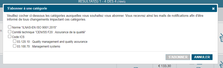 Les utilisateurs ont alors la possibilité de s’abonner soit à la norme technique en question, soit au comité technique qui l’a développée, soit plus généralement au domaine (code ICS) lié à la norme. Ils recevront ainsi des notifications par courriel les informant de tous les changements affectant les catégories sélectionnées.