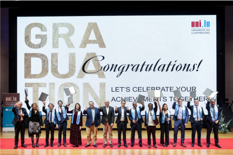Les étudiants se sont vu remettre leurs diplômes par Prof. Philippe Hiligsmann, vice-recteur aux affaires académiques et étudiantes, Prof. Pascal Bouvry, doyen de la Faculté des Sciences, des Technologies et de Médecine, Prof. Eric Tschirhart, directeur d’études du Master MTECH de l’Université du Luxembourg, et Dr. Jean-Philippe Humbert, directeur adjoint du Master MTECH et adjoint à la direction de l'ILNAS.
