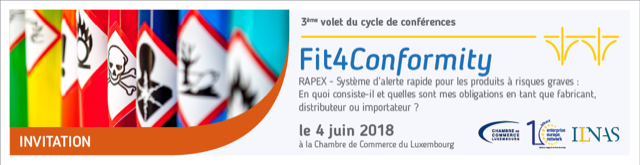 La Chambre de Commerce du Luxembourg et son Enterprise Europe Network-Luxembourg, en étroite collaboration avec l’ILNAS, ont le plaisir de vous inviter à assister au 3ème volet du cycle de conférence « Fit4Conformity » : RAPEX - Système d’alerte rapide pour les produits à risques graves : En quoi consiste-il et quelles sont mes obligations en tant que fabricant, distributeur ou importateur ?