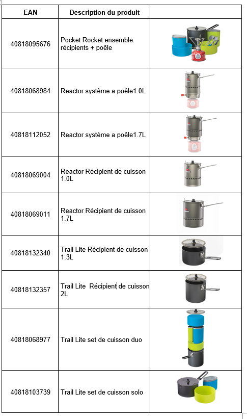 Les produits affectés sont les casseroles de camping MSR Trail Lite ® et Reactor ®, vendues de 2008 jusqu’en février 2024, individuellement ou en kit, y compris les kits de cuisine Trail Lite, les kits de cuisine Pocket Rocket ® et les systèmes de poêle à réacteur :