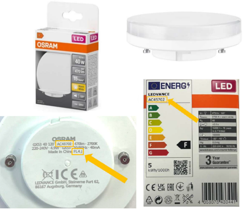 La Lampe LED GX53, décrite ci-dessous fait l’objet d’un retrait du marché et d’un rappel auprès du consommateur en raison de sa non-conformité à la législation relative à la basse tension. Le couvercle en plastique (appelé diffuseur) peut se détacher sous une légère pression, rendant accessible les parties sous tension et exposant l’utilisateur à un risque de choc électrique.