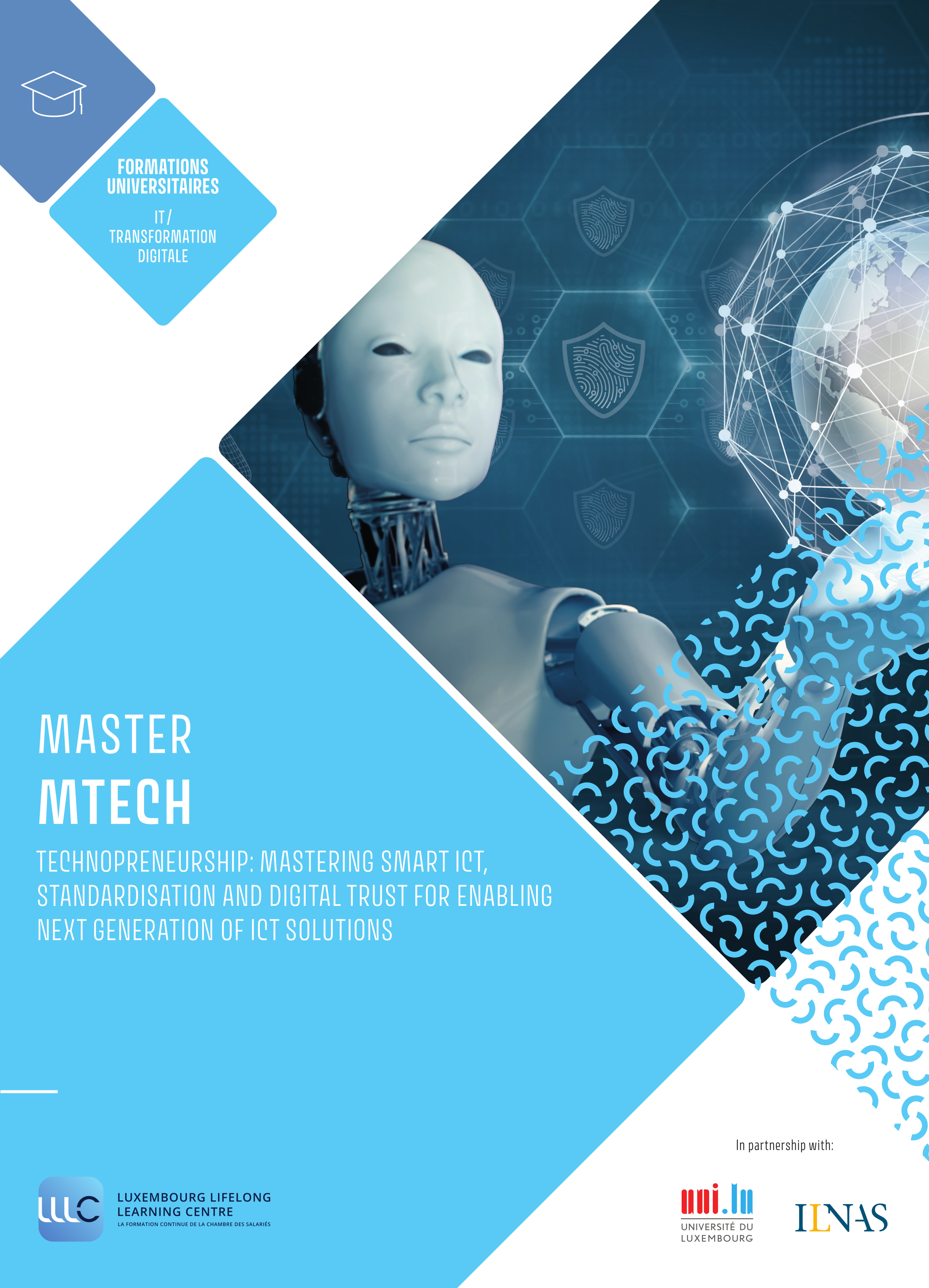 Le Master « Technopreneurship: Mastering smart ICT, standardisation and digital trust for enabling next generation of ICT solutions » (MTECH) est un programme de formation développé par l'ILNAS, en collaboration avec l'Université du Luxembourg et le Luxembourg Lifelong Learning Center (LLLC) de la Chambre des salariés (CSL). Le contenu pédagogique du Master et la sélection des intervenants sont sous la responsabilité de l'Université du Luxembourg et de l'ILNAS, tandis que le LLLC est chargé de la communication et du soutien administratif et logistique.